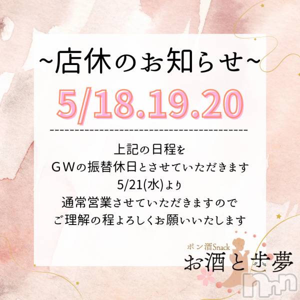 ナイトナビ お店を探す 新潟駅前 新潟駅前・スナック・ガールズバー お酒と歩夢 お店速報一覧 GWの代休になります🙇♀️